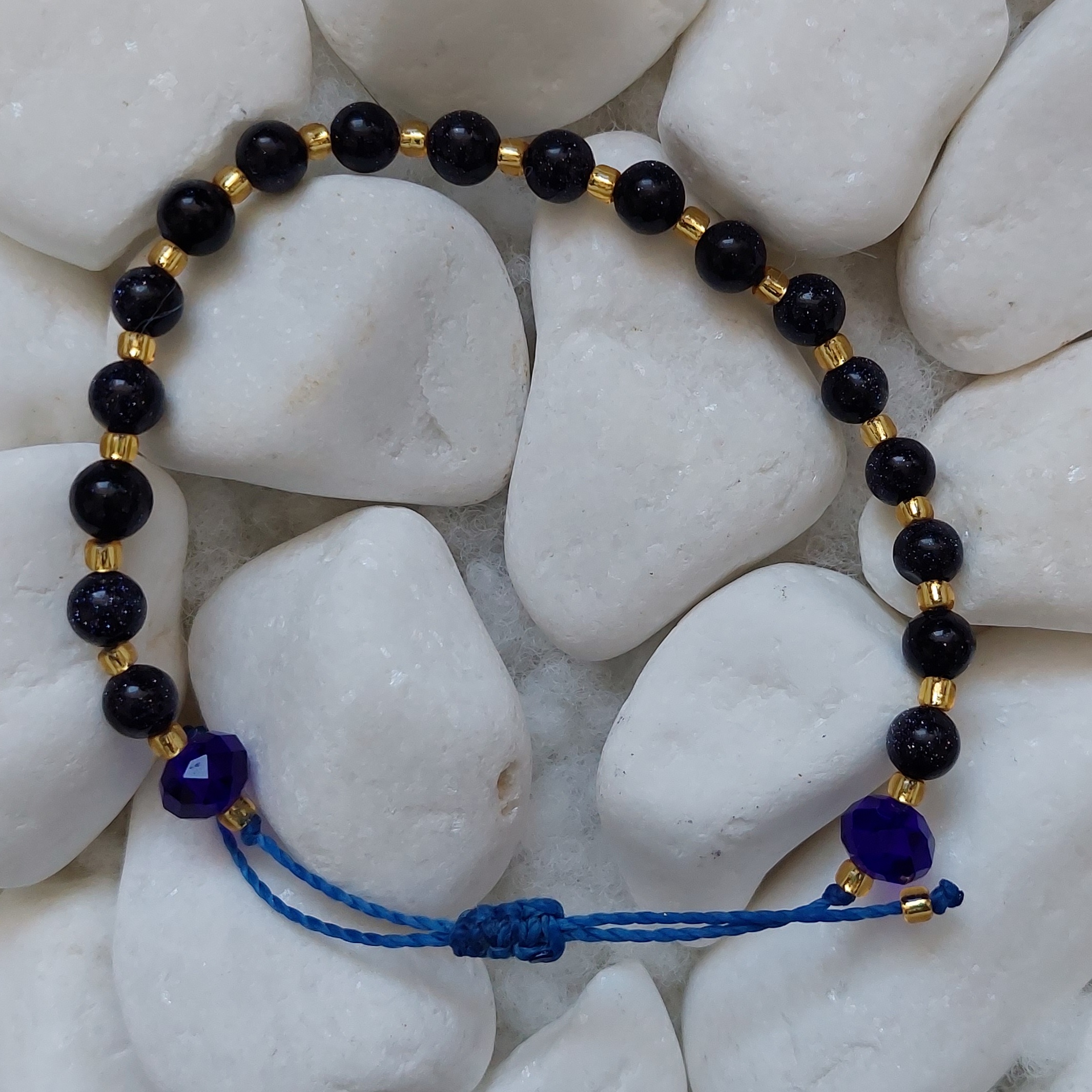 Bransoletka jest regulowana na granatowym sznurku. Kamienie mają średnicę około 6mm,przekładki to koraliki TOHO 8/0 Silver-lined Med Topaz,