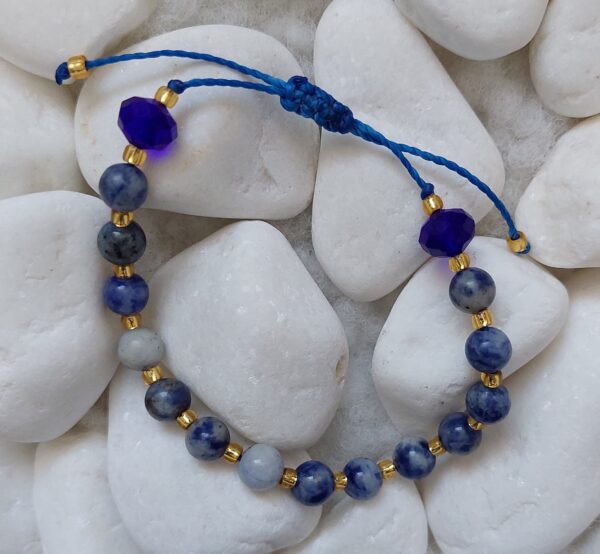 Bransoletka jest regulowana na granatowym sznurku. Kamienie mają średnicę około 6mm, przekładki to koraliki TOHO 8/0 Silver-lined Med Topaz,